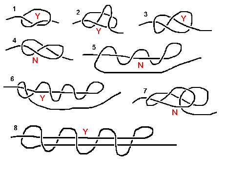 The above eight bits of string are either knotted or not when you pull outwards on the free ends. The puzzle is to tell me YES or NO to the question "Is this a knot?" for each of the eight diagrams. Well, as you can see, the answers are shown. I got three answers, two of them correct. They were John Bownas and Len Brett. Len won the draw. Barry Cant slipped up on number 6 but thanks to all three for having a go. |